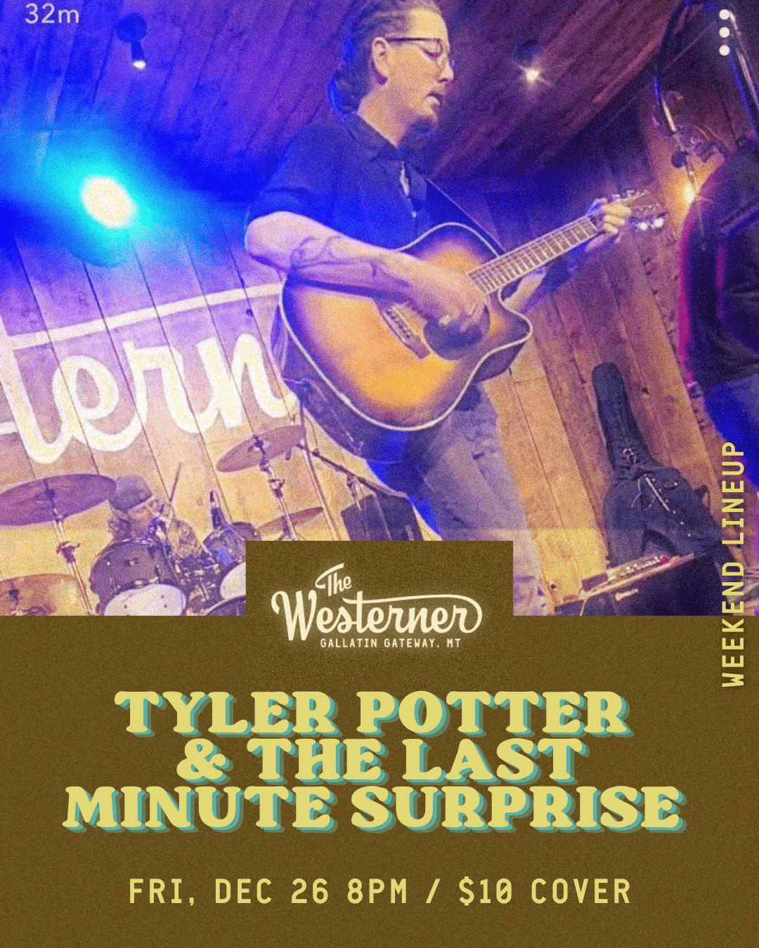 Tyler Potter has been referred to as “Montana’s Honky Tonk Ambassador”, performing stellar originals and covering songs of the likeness of Whitey Morgan and the 78’s, Tyler Childers, Sturgill Simpson and Colter Wall, and Billy Strings, to spanning the genres all the way to The Outfield, Ted Nugent, and Tom Petty and the Heartbreakers.